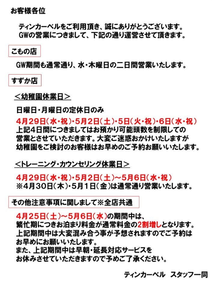 Home › お知らせ › ゴールデンウィーク営業のお知らせ 2026-04-01 ゴールデンウィーク営業のお知らせ 関連記事 🆕 新規受け入れ再開のお知らせ 定休日変更のお知らせ 🆕 料金改定のお知らせ ホームページがリニューアルしました! 料金改定のお知らせ 🆕 料金改定のお知らせ コメントを残す コメントをキャンセルメールアドレスが公開されることはありません。 ※ が付いている欄は必須項目ですコメント ※ 名前 ※ メール ※ サイト 次回のコメントで使用するためブラウザーに自分の名前、メールアドレス、サイトを保存する。 Δ